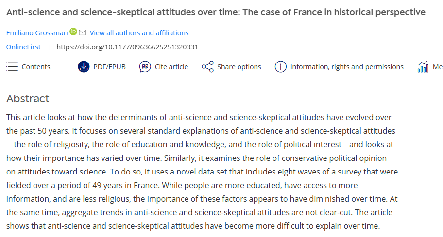 A new article in Public Understanding of Science. The paper builds on 8 surveys fielded since the 1970s to look a the evolution of science attitudes in France.