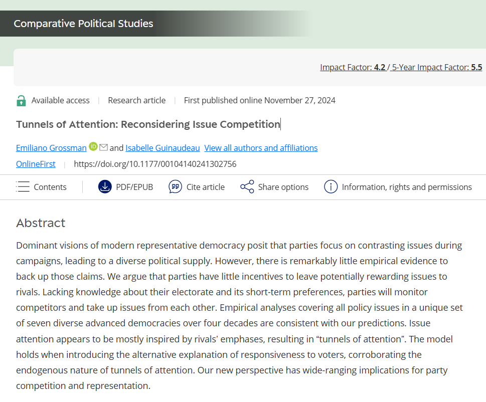 with GUINAUDEAU (Isabelle), Tunnels of attention: reconsidering issue competition, Comparative Political Studies, forthcoming.