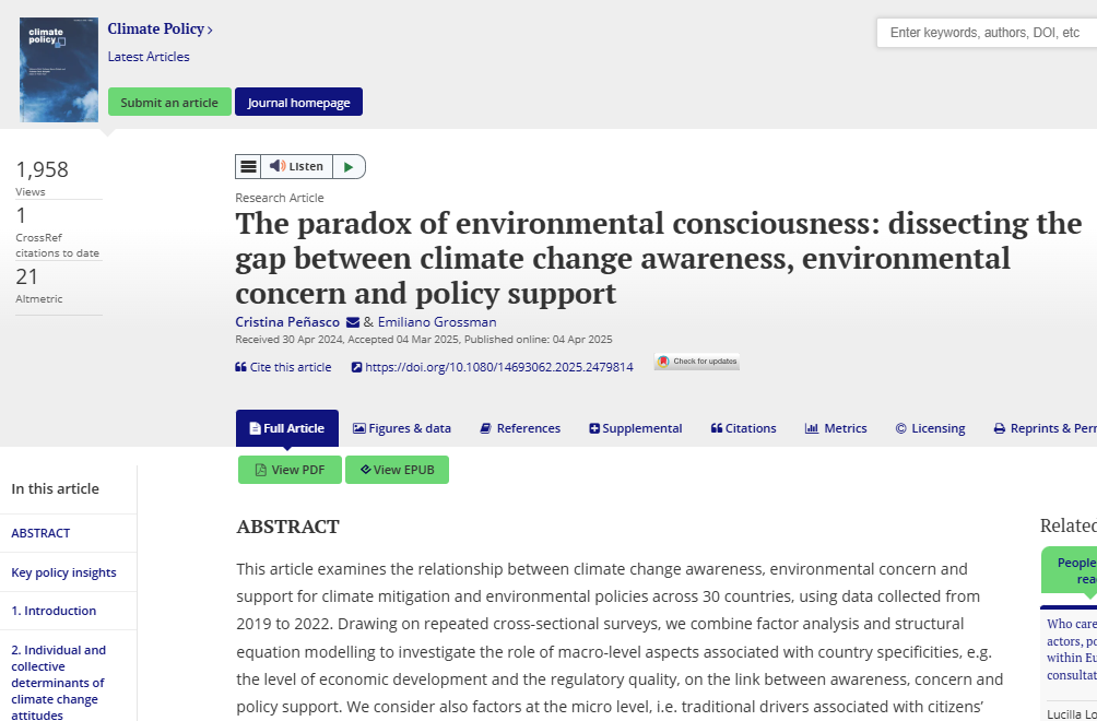 A new paper, with Cristina Peñasco, in Climate Policy. The paper looks at the determinants of acceptance of climate change and public support for climate policies in 30 countries. It is based on survey data for four successive years (2019-2022).